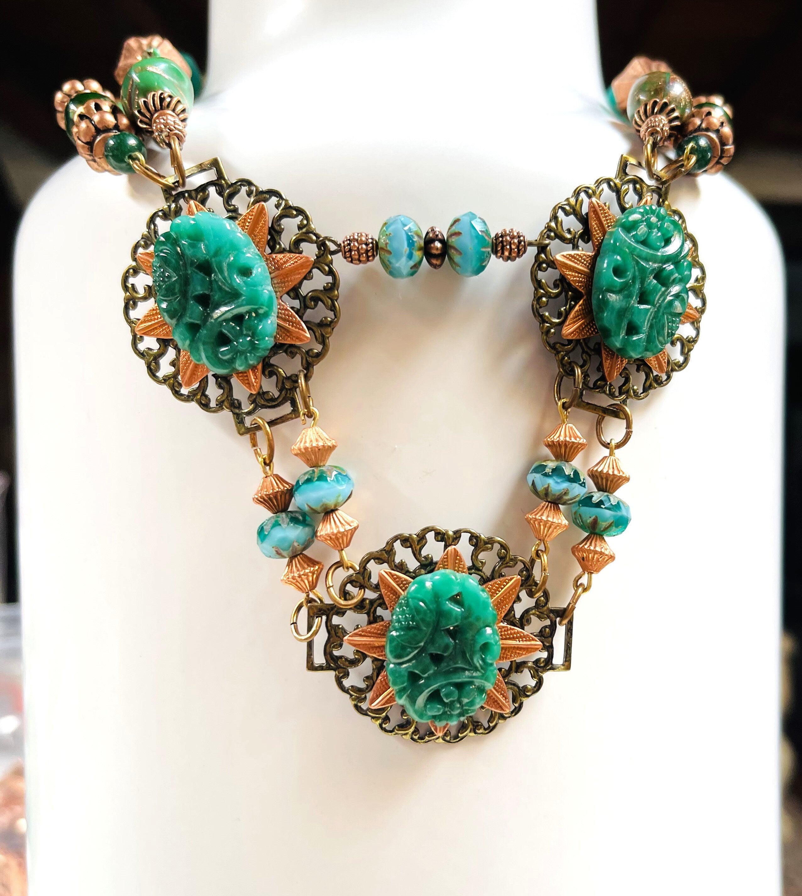 Handcrafted. We use a mixture of rare vintage beads and European Czech Beads (Bohemian Beads)...