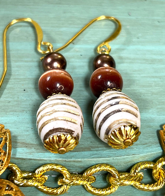 Glass Bohemian Earrings, Vintage White Gold Striped Beads, and Brown Glass. Hypoallergenic French Earring Hooks, Gold Plated Wire..