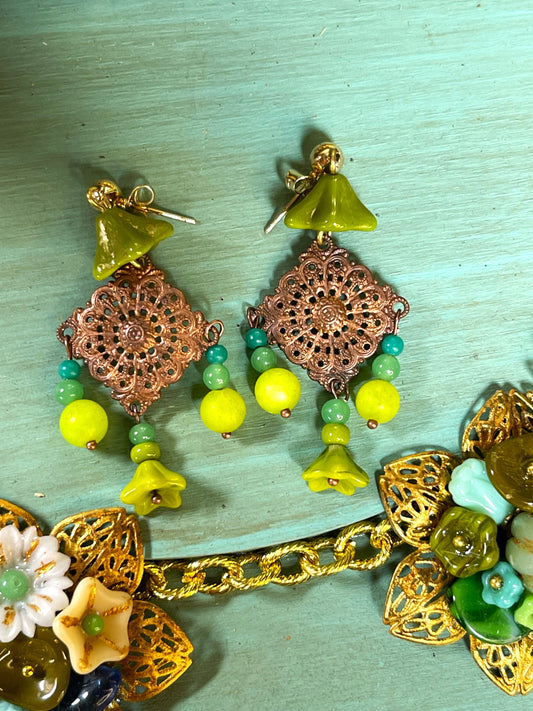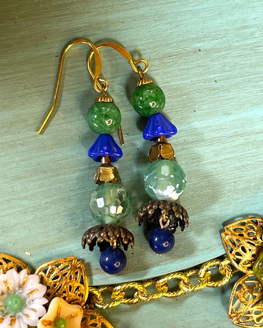 Glass Bohemian Earrings, Green Agate Beads, Green Vintage Beads, and Vintage Brass. Hypoallergenic French Earring Hooks, Gold Plated Wire.