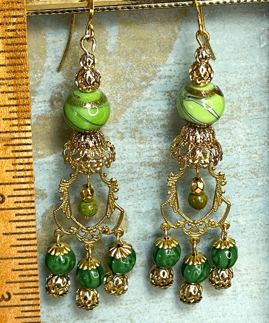 Vintage Drop Chandelier Earrings with Green and Gold Swirl Beads. Gold Brass Metal. Hypoallergenic French Earring Hooks, Gold Plated Wire.