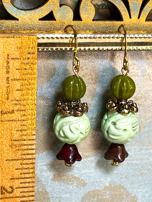 Vintage Glass Bead Earrings, Carved Green Vintage beads. Hypoallergenic French Earring Hooks, Gold Plated Wire..