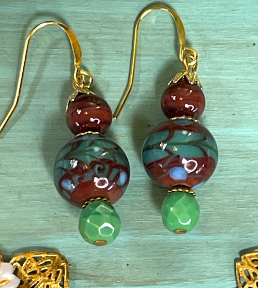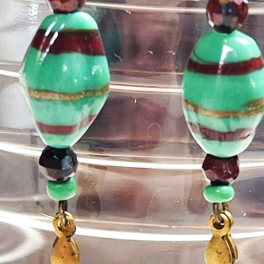 Burgandy, Green Swirl Earrings, Vintage Glass, Hypoallergenic French earrings Hooks, Gold Plated Wire.