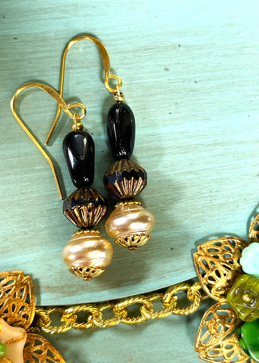 Vintage Glass Bead Earrings, Vintage Glass Pearls, and Black Glass. Hypoallergenic French Earring Hooks, Gold Plated Wire..