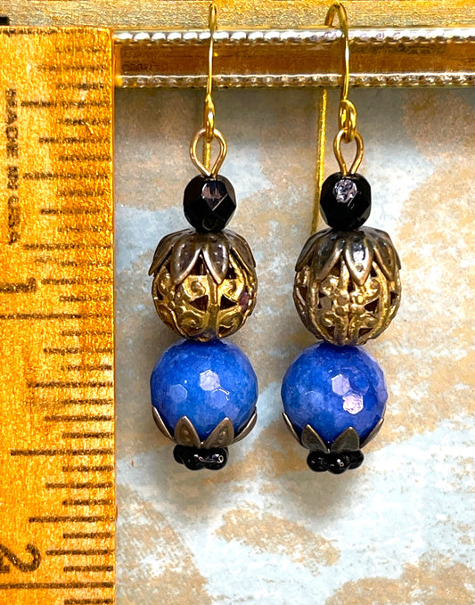 Vintage Glass Bead Earrings, Vintage Blue Glass, and Brass. Hypoallergenic French Earring Hooks, Gold Plated Wire.