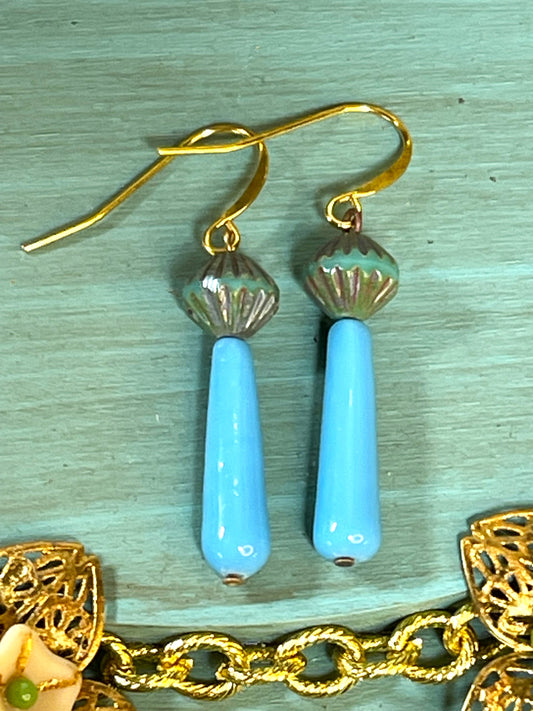 Vintage Glass Bead Earrings, Vintage Blue Glass with Czech Glass. Hypoallergenic French Earring Hooks, Gold Plated Wire.