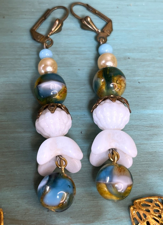 Lovely Marbled Green and white Vintage Glass Bead Earrings With White Flowers. Hypoallergenic French Earring Hooks, Gold Plated Wire.