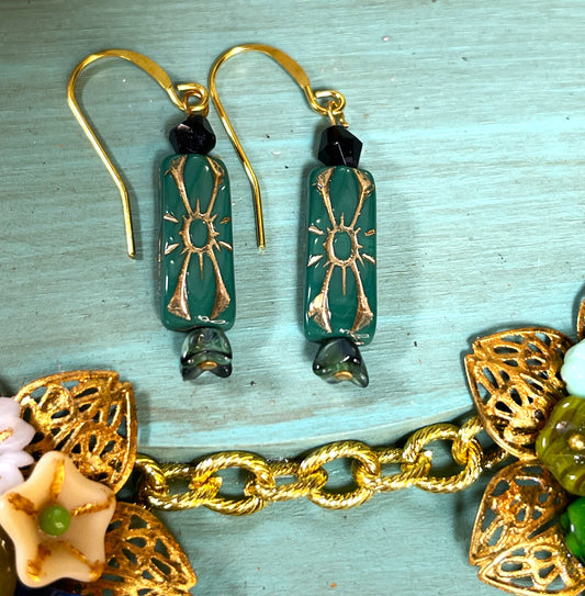 Vintage Hunter Green and Gold Eched Czech Glass Earrings. Hypoallergenic French Earring Hooks, Gold Plated Wire.