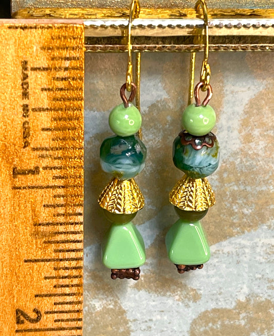 Glass Bohemian Earrings, Green Jade Glass with gold metal. Hypoallergenic French Earring Hooks, Gold Plated Wire..