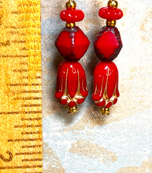 Glass Bohemian Earrings, Red Czech Glass. Hypoallergenic French Earring Hooks, Gold Plated Wire..