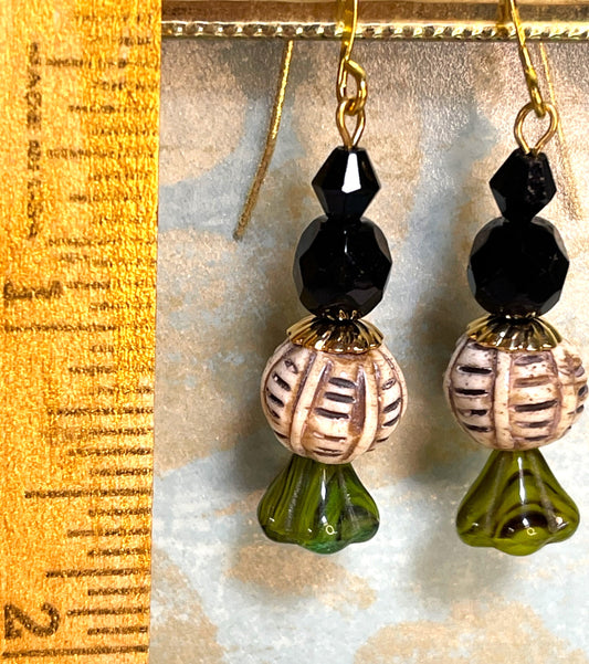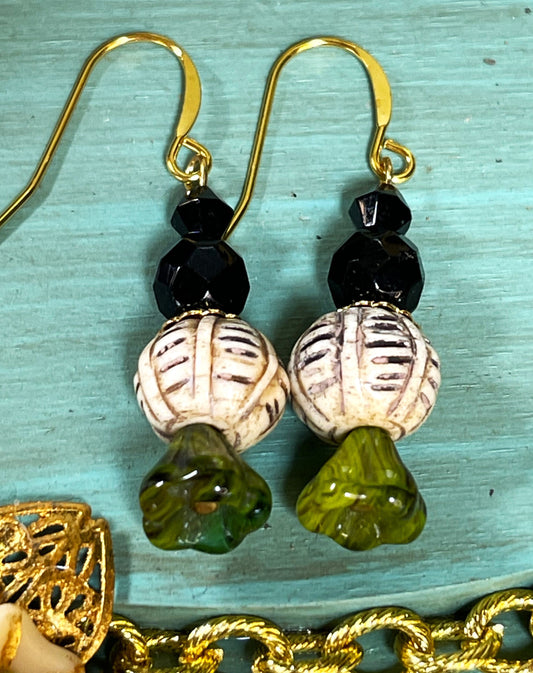 Vintage bone, Black and Green Czech Glass with Etched Beads. Hypoallergenic French Earring Hooks, Gold Plated Wire
