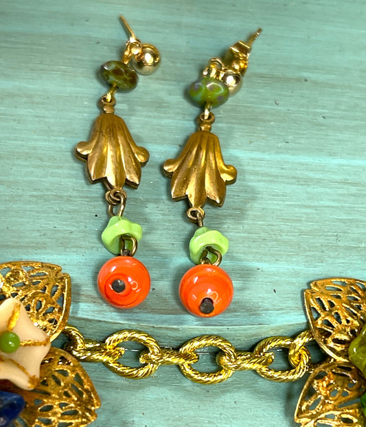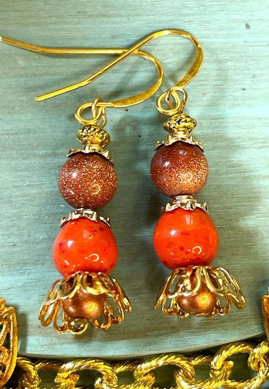 Vintage Glass Bead Earrings, Gold-Stone with Orange vintage Glass and Gold Metal. Hypoallergenic French Earring Hooks, Gold Plated Wire.