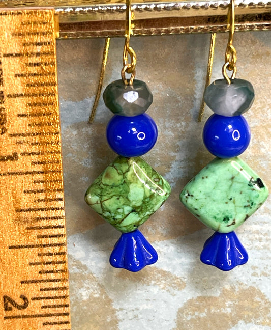 Vintage Earrings, Blue and Green stone. Czech Glass. Hypoallergenic French Earring Hooks, Gold Plated Wire