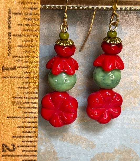 Vintage Glass Bead Earrings, Vintage Green and Red Glass. Hypoallergenic French Earring Hooks, Gold Plated Wire.