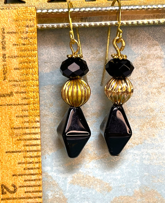 Vintage Glass Bead Earrings, Black and Gold Metal. Hypoallergenic French Earring Hooks, Gold Plated Wire.