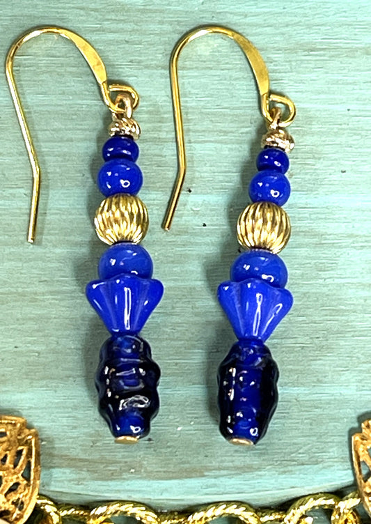 Vintage Cobalt Blue Glass with Gold Metal Corrugated Beads. Hypoallergenic French Earring Hooks, Gold Plated Wire.