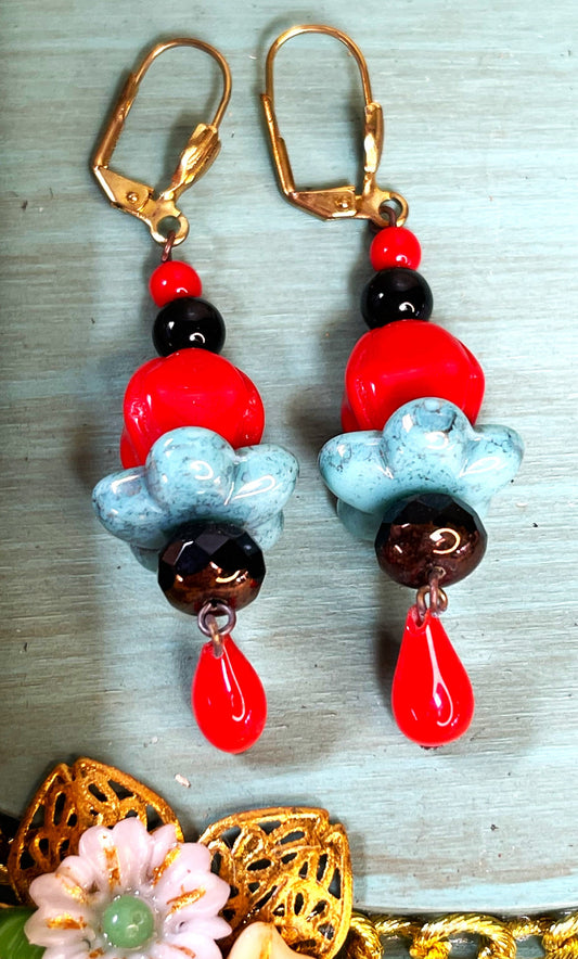 Earrings, Vintage Red, Turquoise Flowers and Black Glass with Red Glass Drops. Hypoallergenic French Earring Hooks, Gold Plated Wire.
