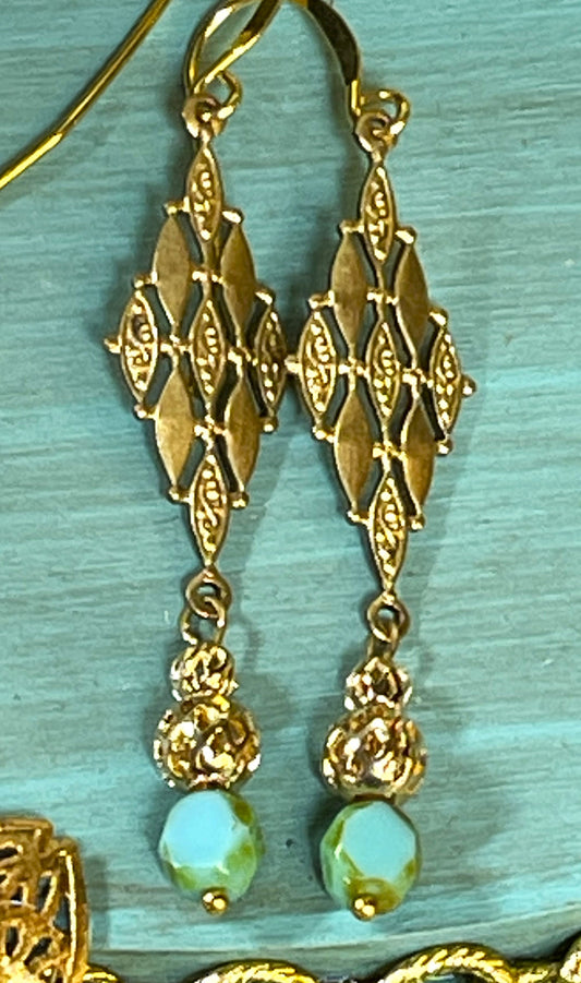 Turquoise Czech Glass Beads with Vintage Gold Metal. Earrings. Hypoallergenic French Earring Hooks, Gold Plated Wire.