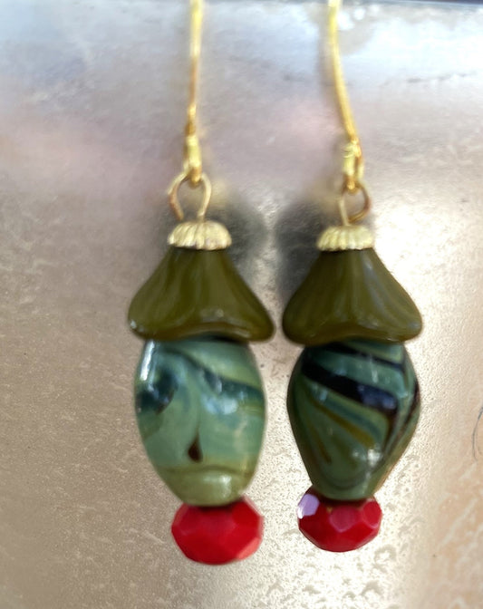 1960's Japanese Olive, Black Swilrl Bead, and Red Glass Drop Beads, Hypoallergenic French Earring Hooks Gold Plated Brass.