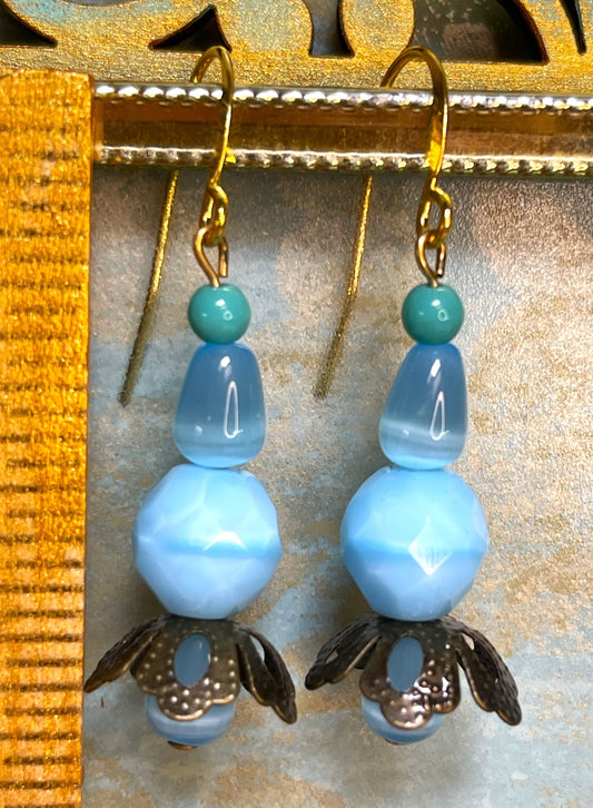 Shades of Blue with Green Glass beads with Metal Flowers Earrings. Hypoallergenic French Earring Hooks, Gold Plated Wire.