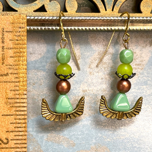 Glass Bohemian Earrings, Green Egyptian Style. Hypoallergenic French Earring Hooks, Gold Plated Wire..