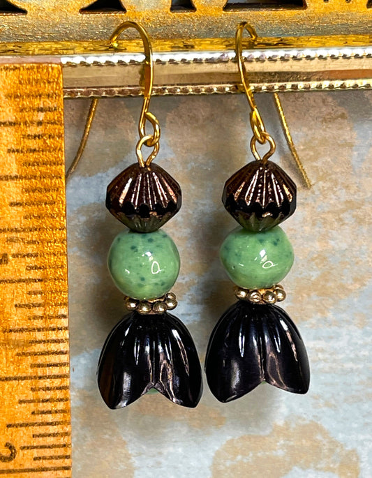 Black Amber and Green Czech Glass. Hypoallergenic French Earring Hooks, Gold Plated Wire