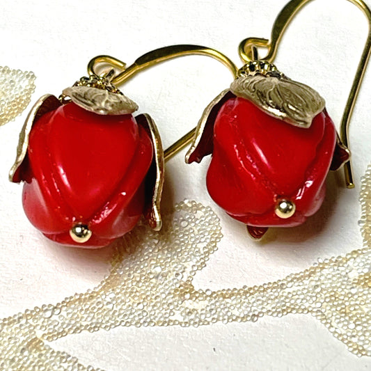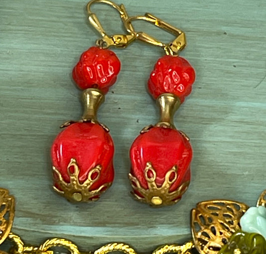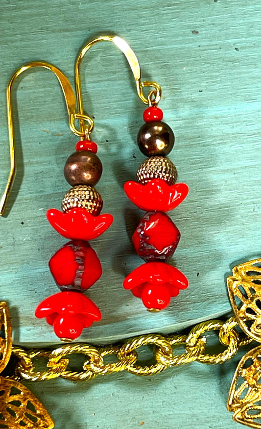 Vintage Red Flowers with gold brass spacer beads. Hypoallergenic French Earring Hooks, Gold Plated Wire..