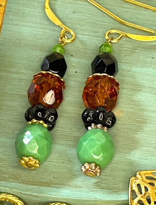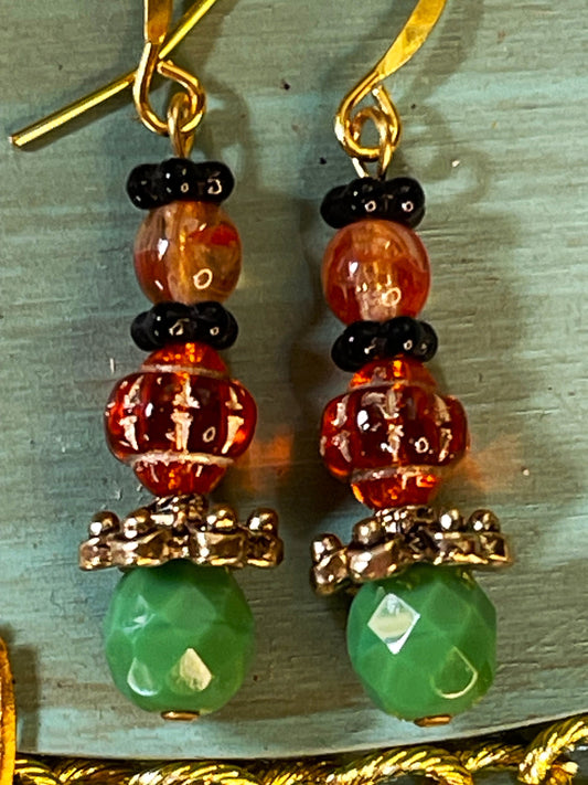 Vintage Orange and Green beads, With Black Czech Glass and Gold Metal Earrings. Hypoallergenic French Earring Hooks, Gold Plated Wire.
