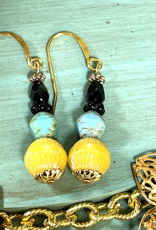 Golden Yellow Vintage Glass with Black, and Blue Czech Glass. Hypoallergenic French Earring Hooks, Gold Plated Wire.