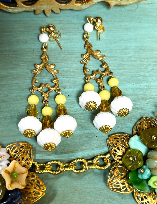 Glass Boho Earrings, 3 Glass Dangles With White and yellow Vintage German Beads . Hypoallergenic PostsBoho