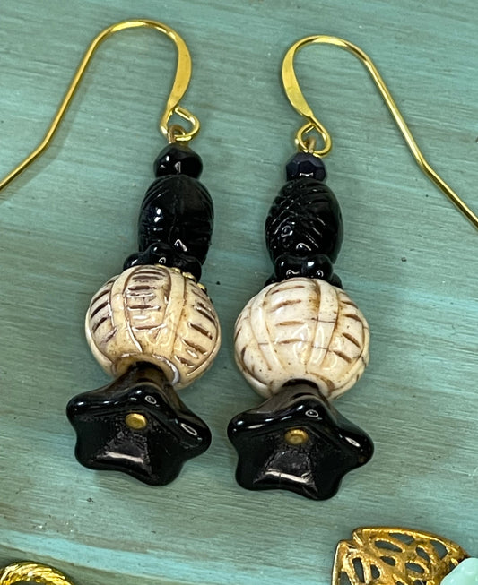 Vintage Earrings, Black, earth-tone carved beads, Czech glass. Hypoallergenic French Earring Hooks, Gold Plated Wire