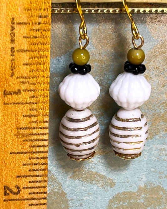 White Striped Gold Glassearrings, with Gold Metal Findings. Hypoallergenic French Earring Hooks, Gold Plated Wire.