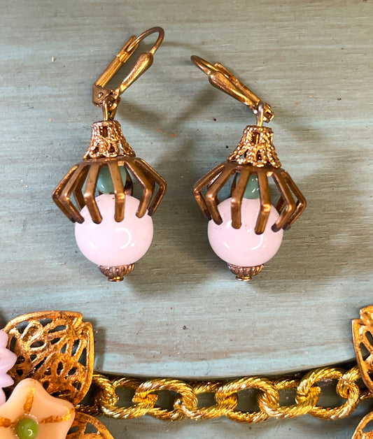 White and Sea Green Glass Beads, Caged in Brass. Earrings. Hypoallergenic French Earring Hooks, Gold Plated Wire.