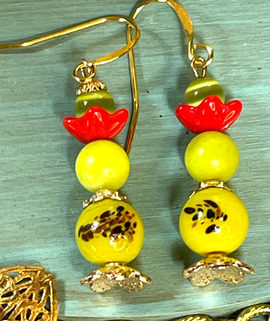 Yellow Japanese Millefiori Glass Bead Earrings with Green glass and Red Flowers. Hypoallergenic French Earring Hooks, Gold Plated Wire.