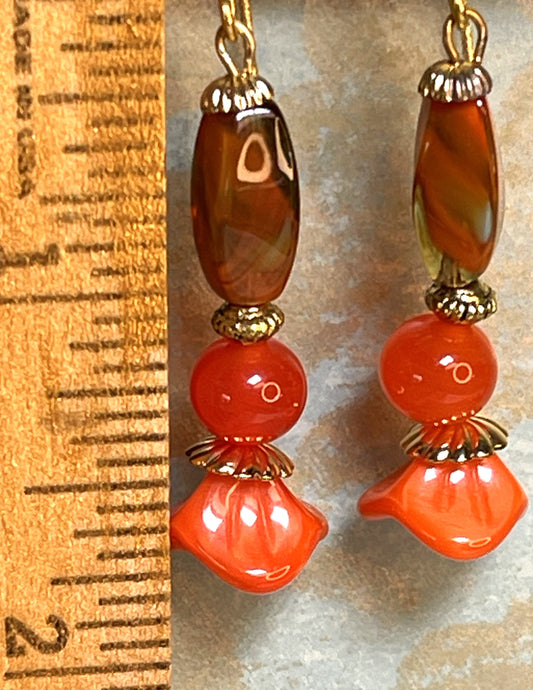 Orange Glass Flower Earrings with Gold Metal. Hypoallergenic French Earring Hooks, Gold Plated Wire.