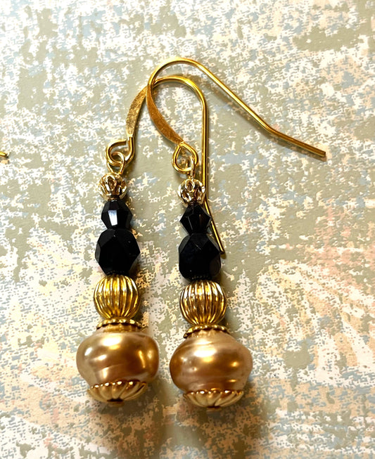 Black Czech Glass with Vintage Champagne Glass Pearls, Gold plate Metal.l. Hypoallergenic French Earring Hooks, Gold Plated Wire.