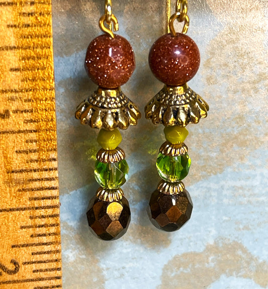 Vintage Earrings, Natural Goldstone, and Brass. Hypoallergenic French Earring Hooks, Gold Plated Wire