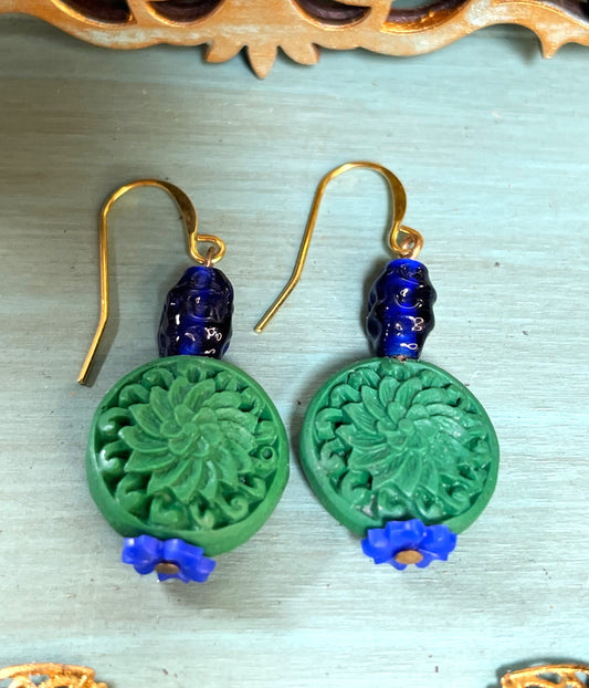 Bohemian Earrings, Green Cinnabar Resin with vintage blue glass. Hypoallergenic French Earring Hooks, Gold Plated Wire