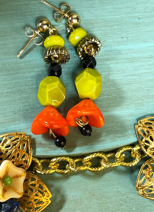 Green Apple and Orange Czech Glass Earrings. Hypoallergenic Post Earring Wire Gold Plated Brass