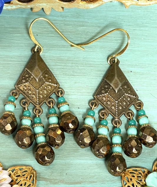 Blue, Bronze, and Gold Czech Glass Deco-Style Earrings. Hypoallergenic French Earring Hooks, Gold Plated Wire.