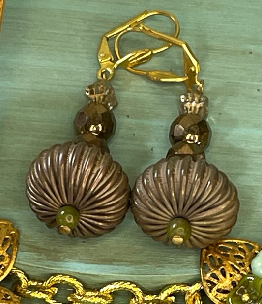 Bronze Glass Beads and Corrugated Melon Metal from the 1960s . Lever Back Ear Wire