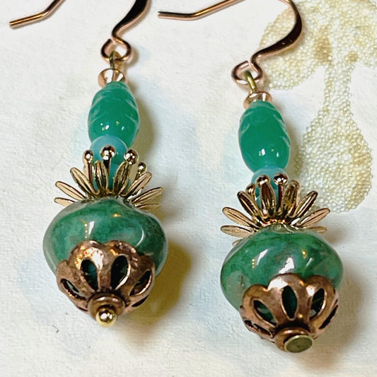 Green and Copper Earrings, Vintage Czech Glass beads. Hypoallergenic French earrings Hooks, Gold Plated Wire.