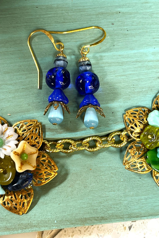 Vintage Glass Bead Earrings, Vintage Blue Glass. Hypoallergenic French Earring Hooks, Gold Plated Wire.