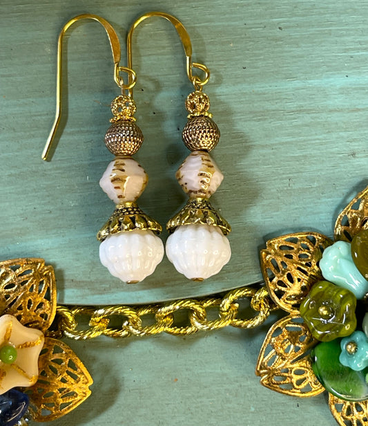 Vintage German White Textured Glass Beads with Gold Textured Metal. Hypoallergenic French Earring Hooks, Gold Plated Wire.