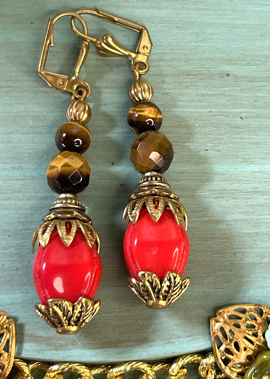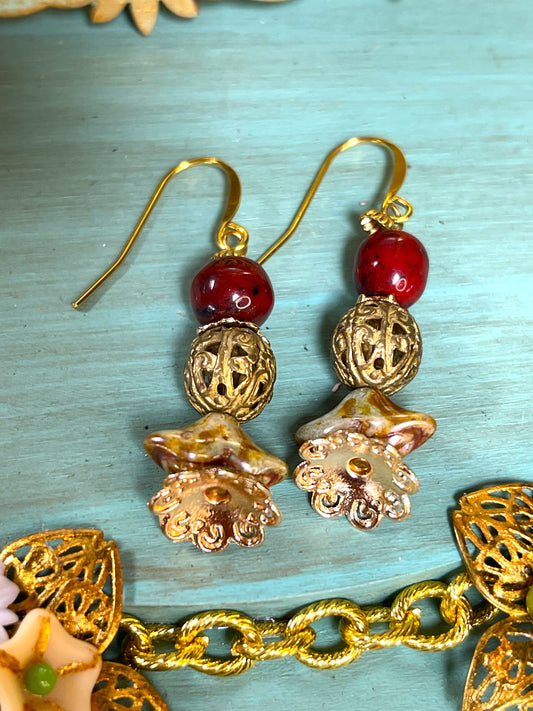 Red with bronze Czech Glass Earrings with exceptional Brass Bead Caps,Hypoallergenic French Earring Hooks, Gold Plated Wire