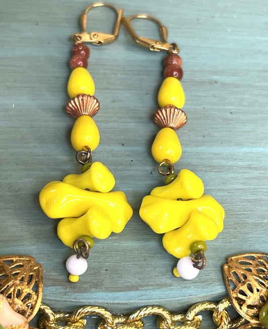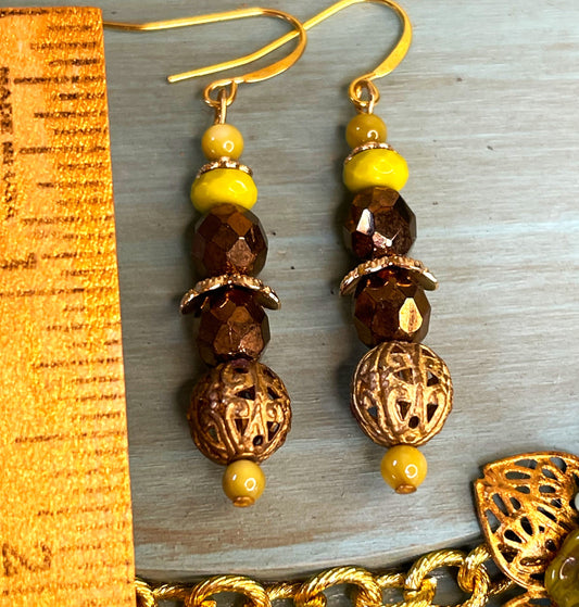 Vintage Earrings, Yellow and copper, Czech glass,Hypoallergenic French Earring Hooks, Gold Plated Wire