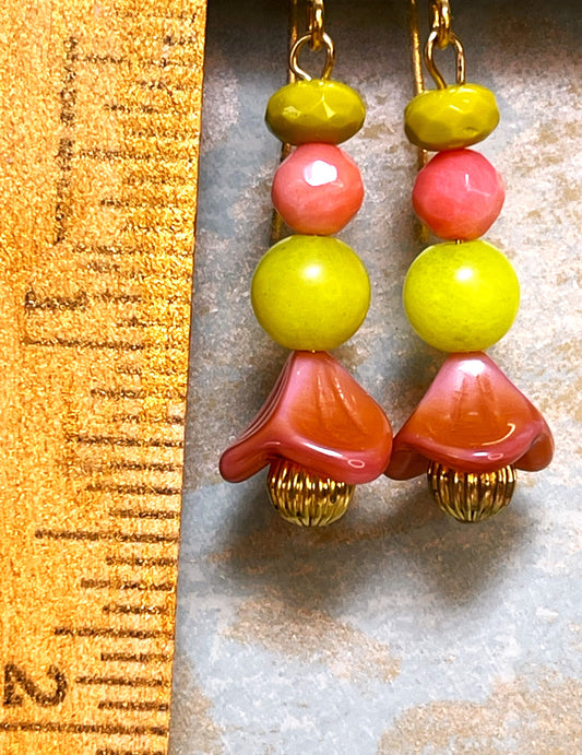 Coral and Apple Green Glass Summer Earrings, Hypoallergenic French Earring Hooks, Gold Plated Wire.