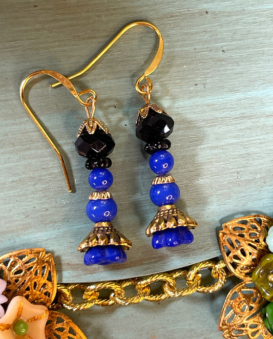 Glass Bohemian Earrings, Black Vintage Beads with Blue Glass. Hypoallergenic French Earring Hooks, Gold Plated Wire.