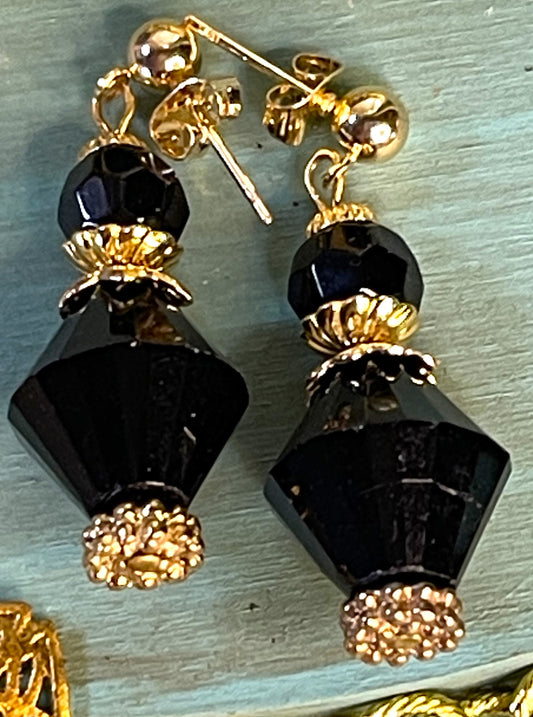 Vintage Glass Bead Earrings, Black Czech Glass with Etched Beads. Hypoallergenic Posts, Gold Plated Brass
