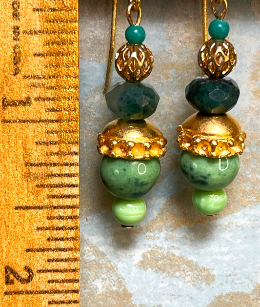 Vintage Green Glass with Gold Metal. Hypoallergenic French Earring Hooks, Gold Plated Wire.