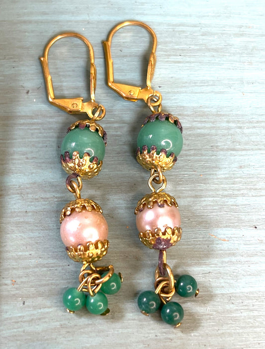 Vintage Glass Jade Earrings, with Glass Pearls. Hypoallergenic French Earring Hooks, Gold Plated Wire.